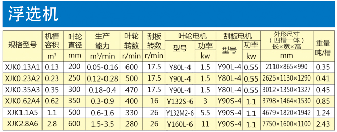 浮選機適用于有色黑色金屬的選別,還可用于非金屬如:煤瑩石、滑石的選別。該浮選機由電動機三角帶傳動帶動葉輪旋轉,產生離心作用形成負壓,一方面吸入充足的空氣與礦漿混合,一方面攪拌礦漿與藥物混合,同時細化泡沫,使礦物粘合泡沫之上,浮到礦漿面再形成礦化泡沫。調節閘板高度,控制液面,使有用泡沫被刮板刮出。  浮選機主要用于選別銅、鋅、鉛、鎳、金等有色金屬,也可以用于黑色金屬和非金屬的粗選和精選。  特點:  1.分選精度高,精煤灰分低,產率高,尤其是對難選煤更顯其優勢,精煤灰分可比常規機械攪拌式浮選機降低1~2%。  2.處理量大,單位體積處理量為常規浮選機的2~3倍。  3.運行成本低,與常規機械攪拌式浮選機比較能節電1/3~1/2。  4.浮選機槽體內無運轉部件,易于維護檢修。  5.對煤質的適應性強  6.占地面積小,節省基建投資。相同處理量時占地面積只有機械攪拌式的40~60%。  7.操作簡單,自動化程度高。  8.重量輕。